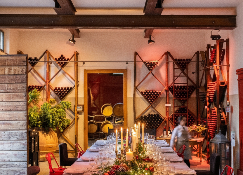 Those who arrive here do not find a reception desk, but a large door opening onto historic living rooms, a long wooden table, a lit fireplace, and a view stretching across vineyards and cypress trees.