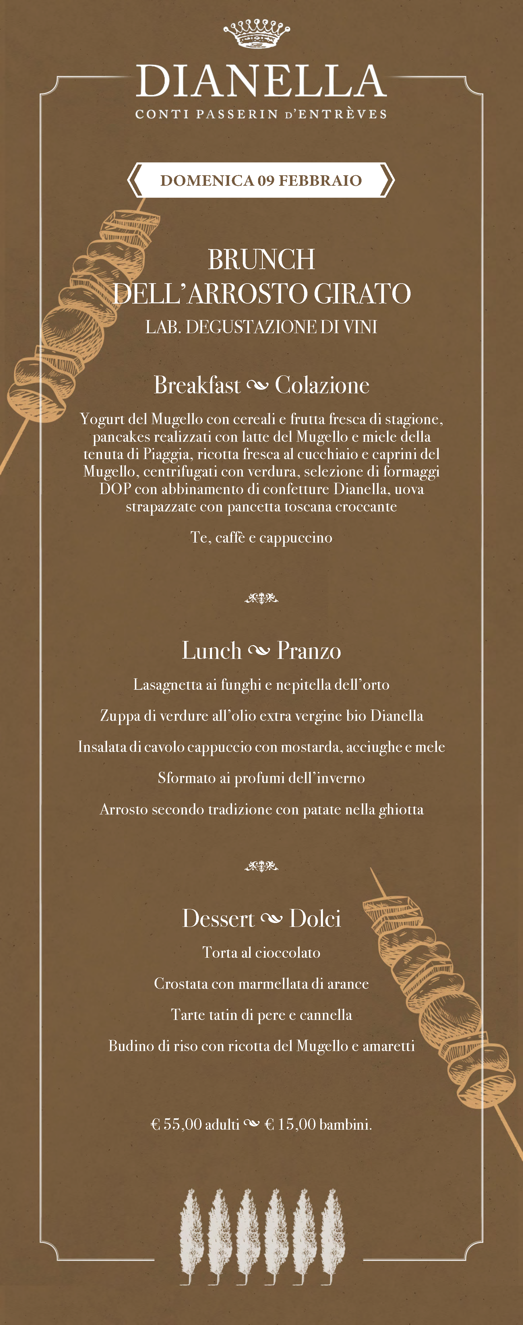 Proponiamo brunch tematici con protagonisti i nosti vini, che celebrano i prodotti di stagione e le eccellenze del territorio: dal tartufo, all’olio nuovo, fino alle castagne e al mitico arrosto girato nell’antico camino della cucina della villa. Ogni appuntamento è pensato per offrire piatti freschi e genuini, preparati con ingredienti di qualità e abbinati ai nostri vini biologici. Gli ospiti possono gustare le creazioni del nostro chef Alessio Bagnoli nei molteplici spazi delle nostre cantine e scuderie circondati dai vigneti e dagli uliveti della nostra tenuta.