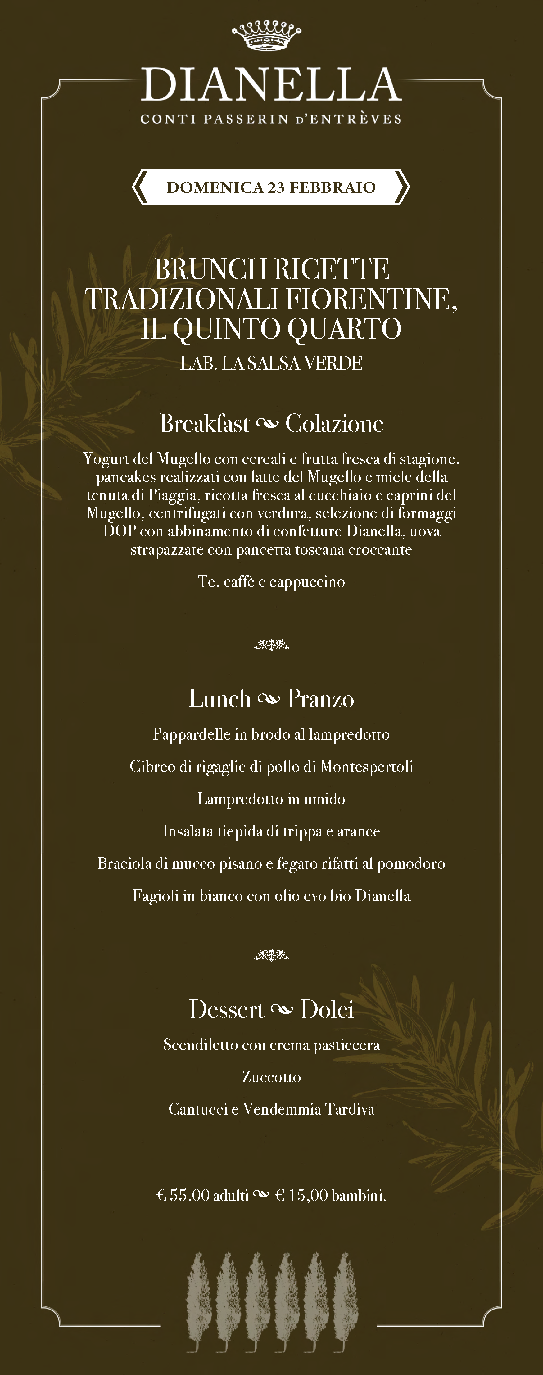A Villa Dianella, ogni brunch è un’occasione speciale per vivere la bellezza e i sapori della Toscana in un contesto unico e raffinato. Ogni domenica, la nostre cantine storiche si trasformano in un punto d’incontro per chi ama il buon vino e la buona cucina e desidera trascorrere una giornata all’insegna del relax e della convivialità.