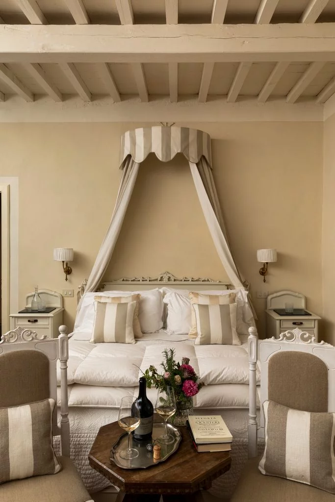 Ampie e luminose camere, elegantemente arredate con mobili antichi e tessuti di pregio. Alcune sono dotate di vestiaire e angolo living, per leggere, lavorare o degustare un buon bicchiere di vino Dianella o iniziare la mattina con un’ottima prima colazione servita in camera. Le camere hanno vista sul giardino o sui vigneti della fattoria. Particolare attenzione anche alla stanza da bagno, un piccolo salotto, dotato di vasca e doccia o doccia ampia e confortevole e con