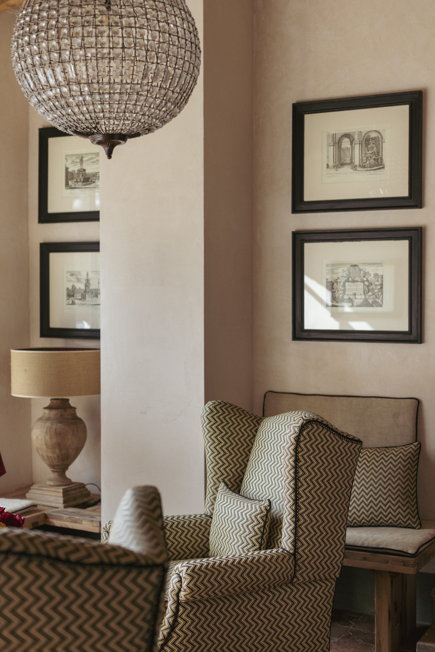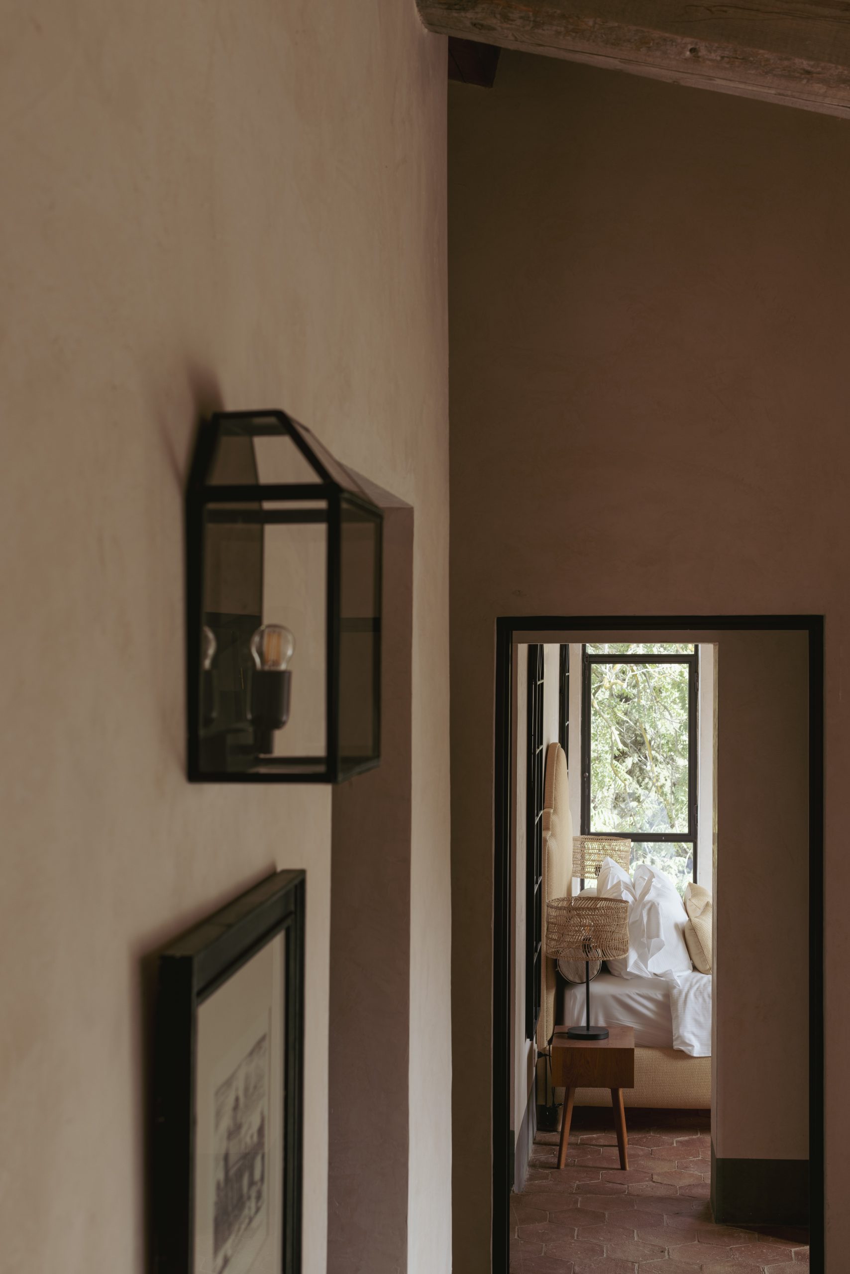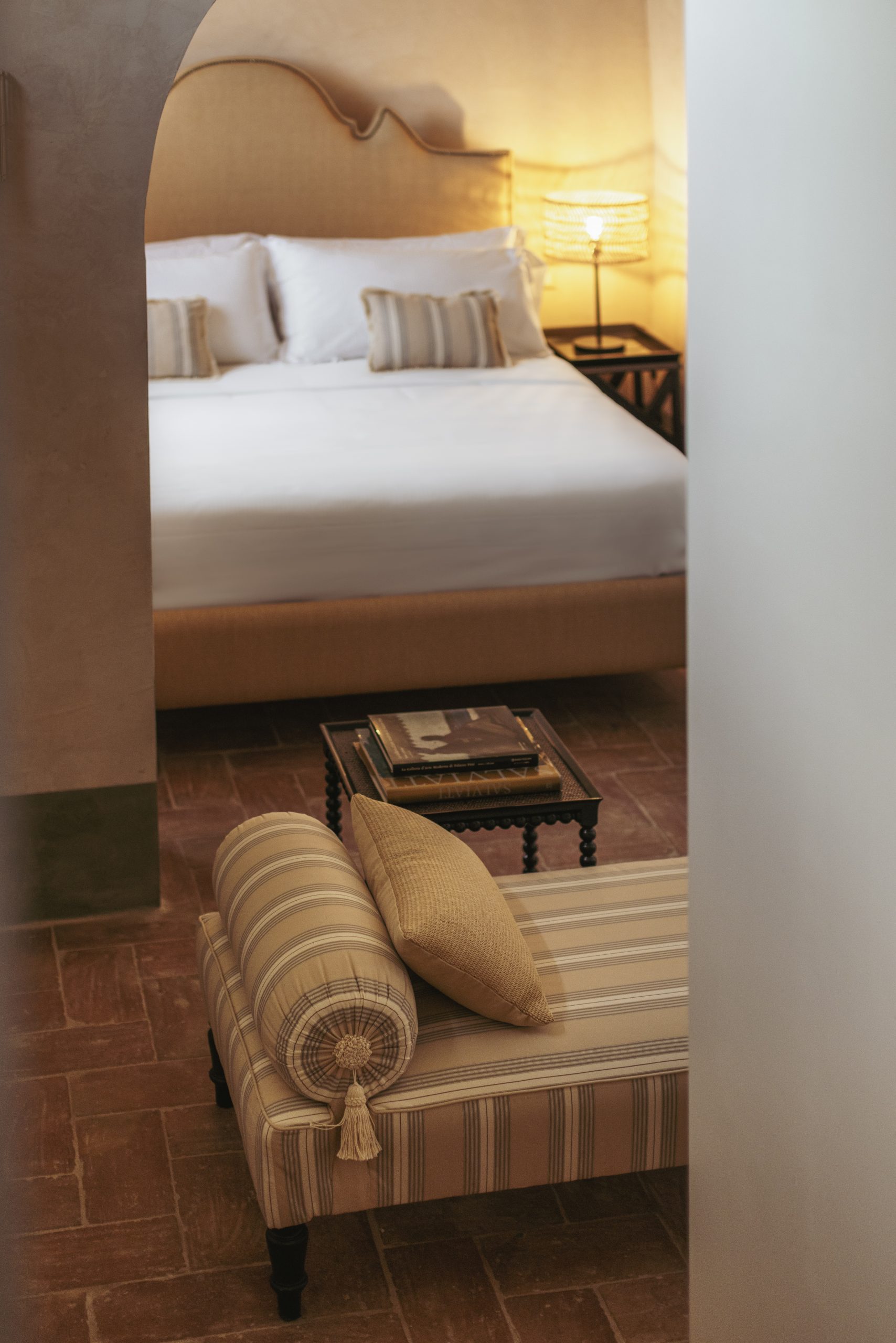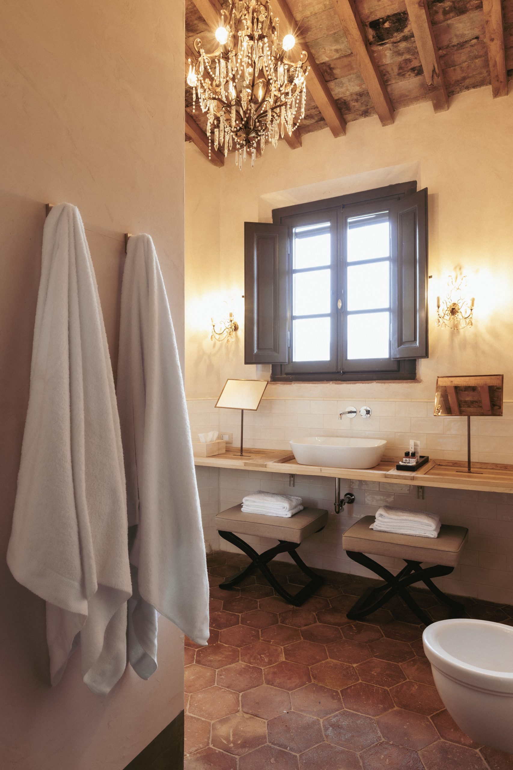 Stanze ampie con finestre grandi e piccole, tutte diverse, e gradini in cotto antico dalle fogge più varie. L’arredamento è in sintonia con i colori dell’edificio, la biancheria è color naturale come la calce viva delle pareti, la paglia di firenze calda come il legno grezzo degli arredi e ben si sposa con il color tufo dei muri esterni. Comodi letti, poltrone e chaise longue creano piacevoli angoli di conversazione. Anche qui le cantinette con i vini della fattoria e bagni con lavandini di recupero e dettagli unici.